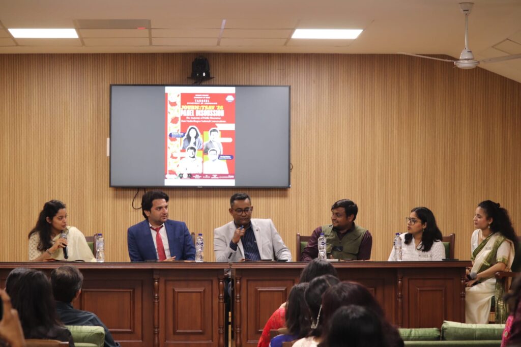इसके बाद, सार्वजनिक विमर्श की संरचना: मीडिया किस प्रकार राष्ट्रीय दृष्टिकोणों को आकार देता है” विषय पर पैनल चर्चा का आयोजन किया गया। पैनल चर्चा में मुख्य अतिथि आर्चना तिवारी (टेड स्पीकर एवं सह-संस्थापक, राजधर्म), आशीष दुबे (एंकर, एबीपी न्यूज़), दिलनवाज़ पाशा (रिपोर्टर, बीबीसी न्यूज़) और पंकज मिश्रा (संपादक, वनइंडिया न्यूज़) रहे। सत्र का संचालन पत्रकार विभाग की अध्यक्षा जांसी और विभाग संपादक अनन्या कुमार द्वारा किया गया।